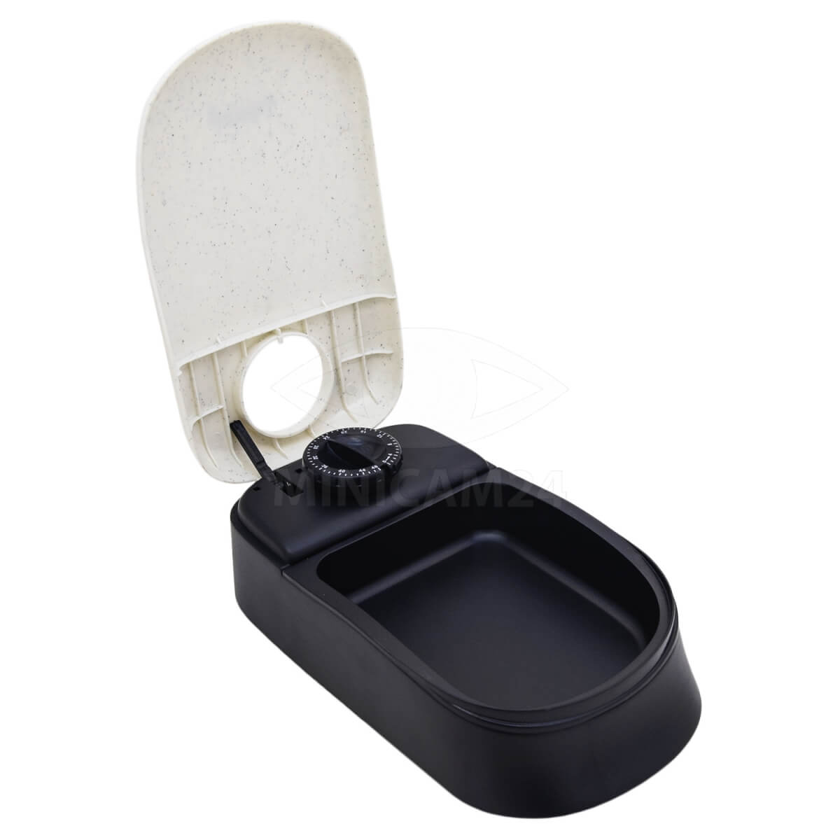 Автоматическая кормушка из черного пластика. Рассчитана на одноразовое кормление по установленному времени. Максимальный период таймера составляет 48 часов. По истечении заданного времени крышка, закрывающая емкость с кормом, откидывается вверх на пружинке и открывает доступ к пище. Емкость лотка - 300 мл. Для питания автокормушки используется одна батарейка формата АА.